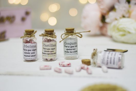 Frasco de cristal con tapita de corcho. Con mensaje personalizado, con caramelos en el interior(no comestibles). Lazo de yute. Para decorar tu evento y darle un toque personalizado.