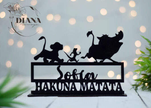 Topper Hakuna Matata. Quieres regalar algo único, tierno y original? Aquí te dejamos nuestro topper de hakuna matata, para decorar ese rincón favorito y darle un toque alegre y divertido. Al igual que todos nuestros productos podrás personalizarlo con el nombre o nombres que quieras, detalla como quieres en la nota de tu pedido. Caracteristicas: Puedes elegir 3 colores diferentes para el acabado de tu topper: Blanco, Negro o Madera. Incluye una base para sujetarlo.